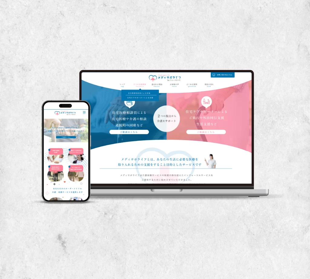 「メディサポライフ」のウェブサイトデザインは、ユーザーに安心感と信頼感を与えることを目的としています。全体の配色は、柔らかく落ち着いたトーンの**ブルーとピンク**を基調としており、これにより医療サービスの信頼性と温かみを表現しています。この配色は、特に医療関連のサイトで安心感と清潔感を醸し出すのに適しており、利用者にとって親しみやすい雰囲気を作り出しています。 トップページには、視覚的に分かりやすい大きなバナーが配置されており、訪問者がすぐに「メディサポライフ」が提供するサービスの概要を理解できるようになっています。バナーの上部には、シンプルでキャッチーなキャッチコピーがあり、サービスの特長や利点を強調しています。また、訪問者が求める情報にすぐにアクセスできるよう、わかりやすいナビゲーションメニューが配置されており、ユーザビリティを重視した設計になっています。 このウェブサイトは、特に高齢者やその家族、介護を必要とする方々をターゲットにしています。コンテンツの中には、具体的なサービス内容や料金、利用方法などが詳しく説明されており、初めて訪れる方でも簡単に理解できるよう工夫されています。また、各サービスのページには、実際の利用者の声や体験談が掲載されており、信頼性を高める要素となっています。 さらに、サイトはレスポンシブデザインを採用しており、スマートフォンやタブレットなどの様々なデバイスからでも快適に閲覧できます。これにより、ユーザーはいつでもどこでも必要な情報を簡単に取得できるため、非常に便利です。 「メディサポライフ」のウェブサイトは、利用者に安心してサービスを利用してもらえるよう、透明性を大切にしています。デザインとコンテンツを通じて、訪問者が「メディサポライフ」の提供するサービスに対して信頼と安心を感じ、実際の利用へとつながることを目指しています。このサイトが、利用者にとって役立つ情報源となり、必要なケアを見つける一助となることを願っています。